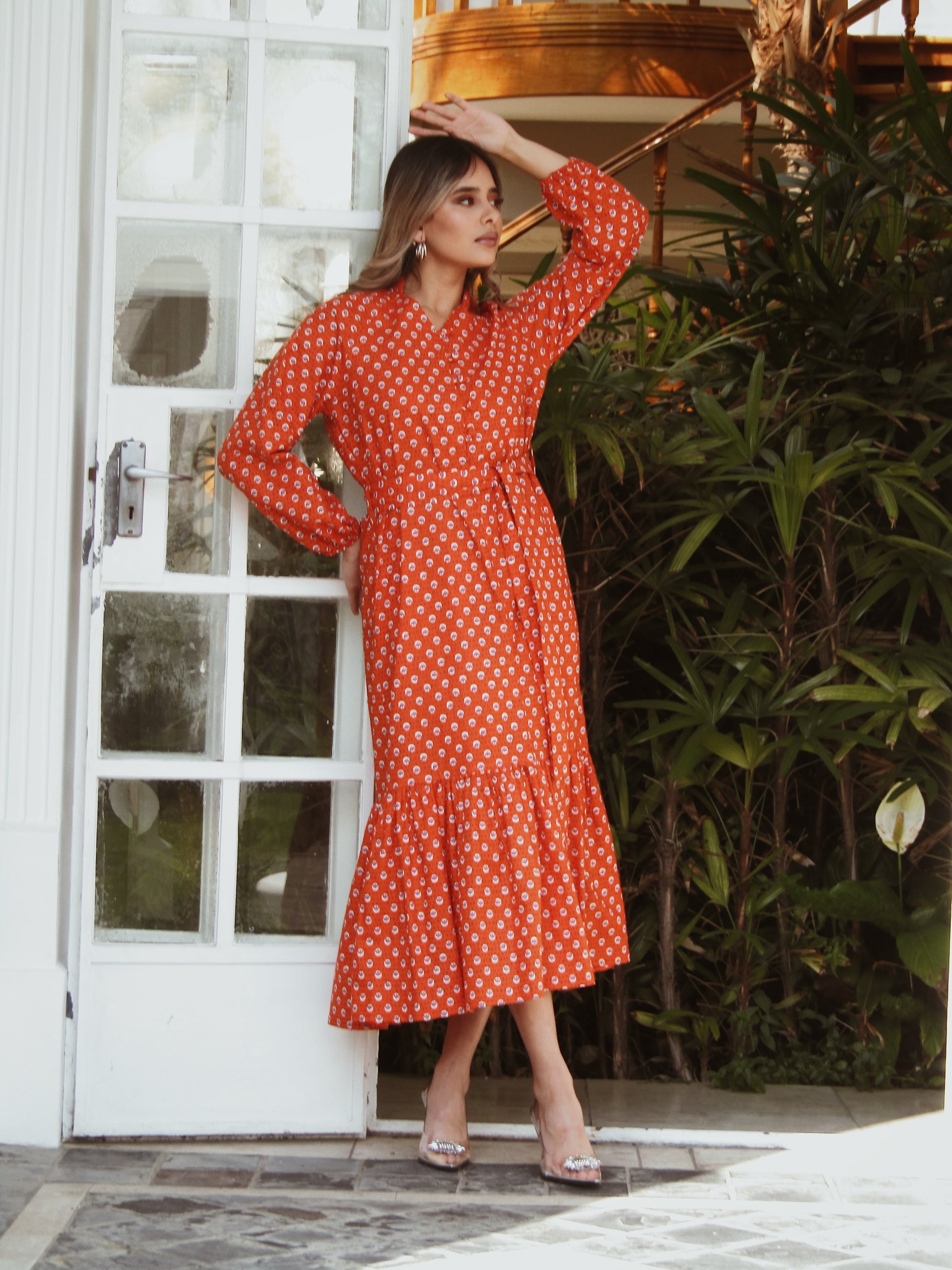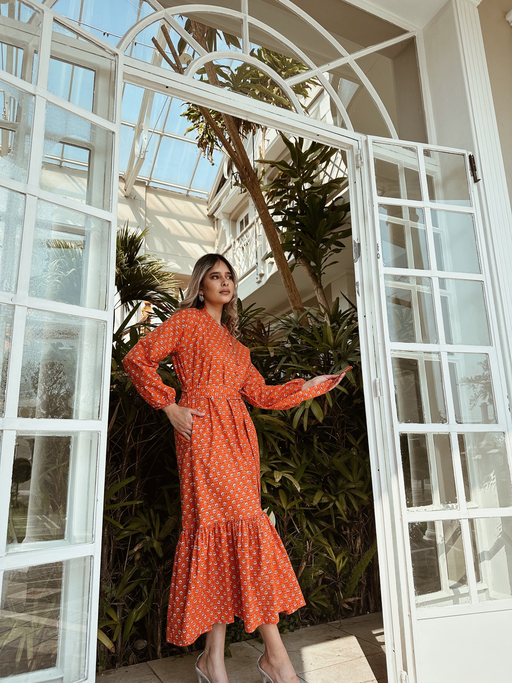 Our iconic resort dress has become an essential in almost every collection, as we can't imagine life without it! Through continual refinement, it's won the admiration of many with its dazzling design and perfect fit - including a mandarin collar with functional button stand (with covered custom buttons), raglan sleeve with elasticated cuff, and a belt placed to flatter any figure. This season, we've brought back the beloved dress in a stunning orange-printed Indian cotton for an exotic twist.
